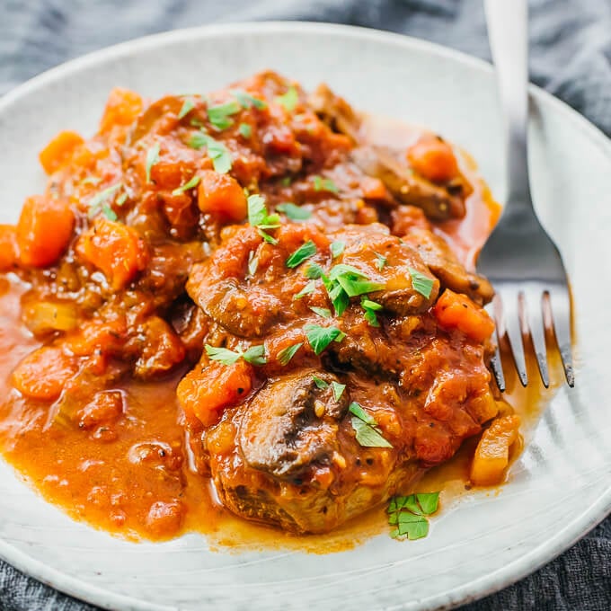 Instant Pot Swiss Steak with mushrooms and a rich tomato sauce -- perfect if you're looking for comforting low carb and keto beef dinners.